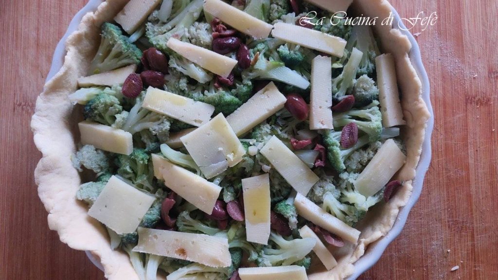 Dispose la pâte sur un moule badigeonné d’huile d’olive et pique le fond avec les dents de la fourchette. Garnis avec à la base la moitié du fromage coupé en tranches, le chou-fleur, les olives précédemment dénoyautées et le fromage restant pour couvrir.