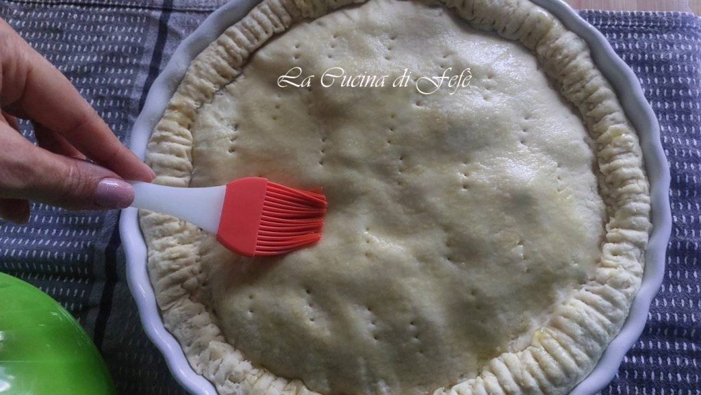 Étale la deuxième pâte pour réaliser l’abaisse avec laquelle recouvrir la scacciata. Replie les bords de manière à former un cordon et scelle avec les dents d’une fourchette.