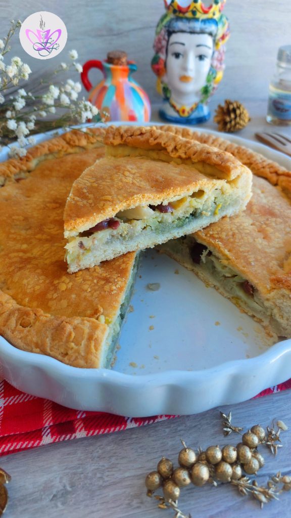 Quand on me demande quel est le plat par excellence le plus riche en histoire et tradition de la cuisine catanese, je n’hésite pas, je réponds la scacciata! Ce plat rustique salé à base de semoule de blé dur comme le cucciddatu, de génération en génération, est en effet devenu un véritable symbole de la gastronomie sicilienne, apprécié tant pour sa polyvalence et son adaptabilité à toute occasion de convivialité, que pour son indéniable goût! Elle se présente comme une sorte de focaccia farcie, à base d’ingrédients simples méditerranéens, mais bien combinés entre eux et à la saveur prononcée, comme pommes de terre, brocolis ou épinards, blettes, tomates, fromage, anchois, origan, etc. Un must, en somme, qui ne peut jamais manquer sur la table des Siciliens, surtout pendant la période des fêtes de Noël! Sa préparation, comme tous les levés, demande un peu de temps et de patience, mais le résultat final en vaudra certainement la peine! Le choix des garnitures peut varier considérablement, de l’utilisation de légumes locaux à l’emploi de fromages et charcuteries typiques. Petit à petit, je te montrerai les différentes spécialités, en attendant aujourd’hui je te propose la version que je préfère, celle avec le chou-fleur violet de Sicile et les anchois à l’huile! Une fois sortie du four, tu pourras la déguster chaude ou froide, coupée en tranches et servie comme entrée ou plat principal. Tu en tomberas amoureux! Et si tu aimes les spécialités catanaises, ne manque pas la recette des zeppole de riz, elles sont irrésistibles!