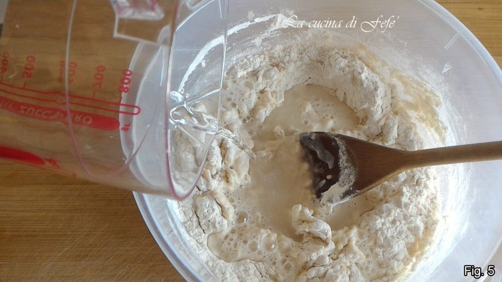 Dans un petit bol, dissolvez la levure de boulanger avec un peu d’eau prise sur le total et mélangez bien avec une louche (fig. 3).