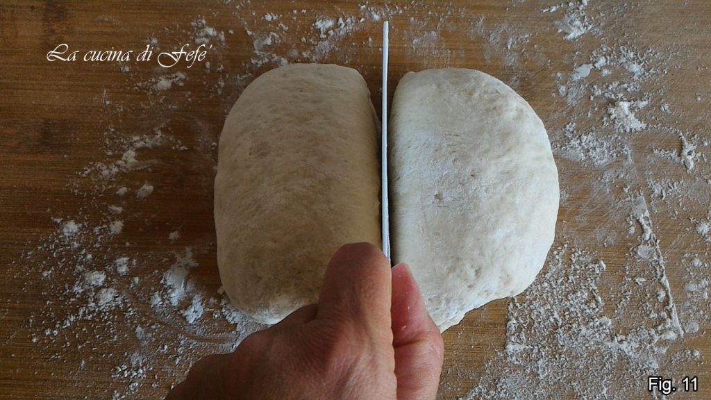 Retournez la pâte en la faisant glisser sur une planche farinée, sans la forcer et effectuez un pliage en portefeuille, c’est-à-dire en pliant un côté vers le centre puis l’autre côté à l’opposé jusqu’à former un pâton que vous boulez*. Enfin, avec l’aide d’une corne ou d’un racloir, divisez-le en deux parties, l’une légèrement plus grande que l’autre (fig. 11).