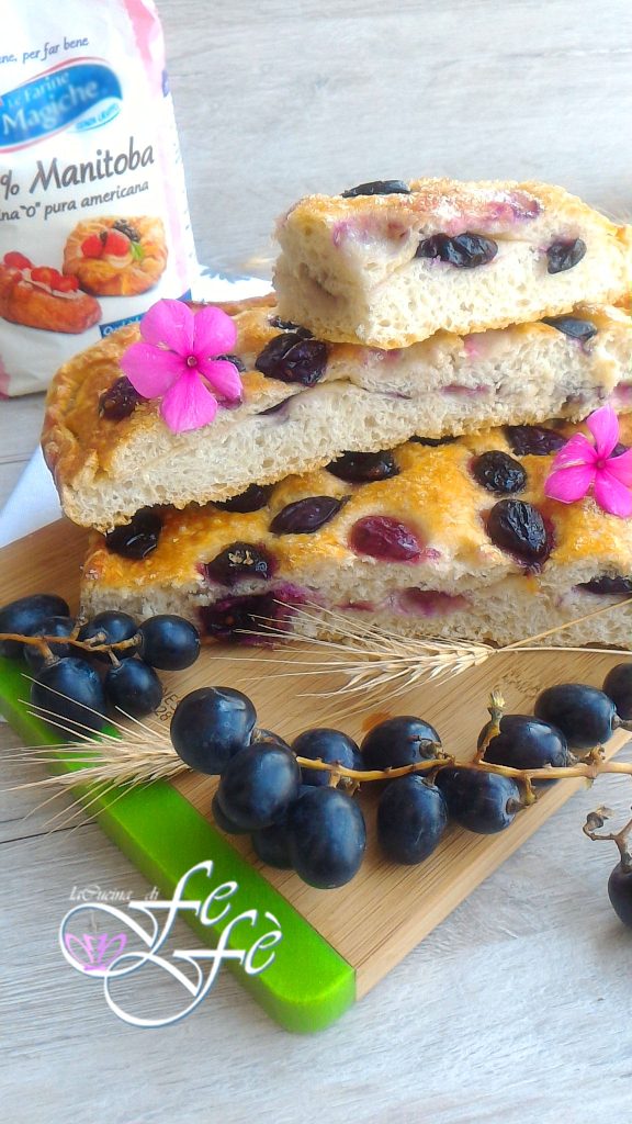 Enfin ici en Sicile, les températures semblent plutôt automnales, l’air est définitivement plus agréable et respirable et allumer le four devient même une agréable cocooning ! D’autant plus si c’est pour une occasion spéciale comme le rendez-vous avec la rubrique Le Grenier, où j’ai choisi de préparer une pâte levée avec des fruits de saison que j’aime beaucoup, le raisin ! Il s’agit d’un dessert typique de la Toscane, surtout dans les régions de Prato et Florence, qui tire sa douceur plus du fruit qui en est le protagoniste, que du sucre qui est ajouté entre une surface et l’autre dans la pâte ! En effet cette focaccia prévoit deux couches avec un cœur moelleux et délicat qui vous séduira dès la première bouchée ! Elle sera parfaite à tout moment de la journée, au petit-déjeuner, au goûter ou comme dessert de fin de repas ! Cependant, vous devez me croire sur parole si je vous dis que vous l’apprécierez encore plus si vous l’associez à un apéritif informel avec des fromages ! En famille, nous avons fait cette merveilleuse découverte, en dînant avec cette focaccia douce en tranches avec du fromage à tartiner qui était parfait ! Je vous invite à retrousser vos manches et à l’essayer tout de suite ! Vous ne serez pas déçus, promis !