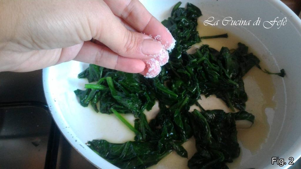 • Pour préparer les sofficini, commencez par la farce. Après avoir lavé les épinards sous l’eau courante, laissez-les flétrir 5′ dans une poêle avec une gousse d’ail, deux tours d’huile et leur seule eau de végétation (fig. 1).