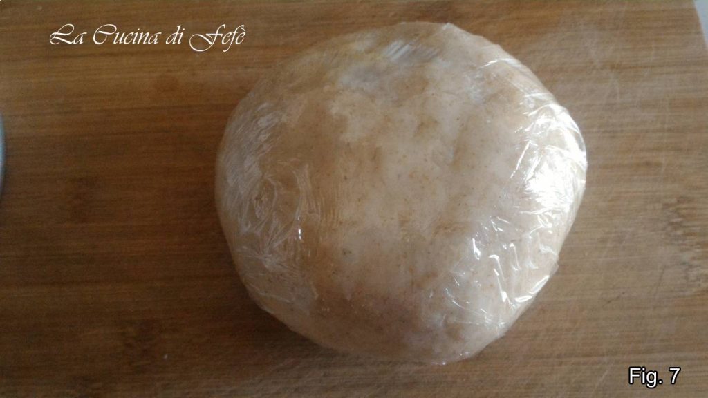 • Une fois tiède, travaillez le mélange jusqu’à obtenir une boule ferme et homogène. Enveloppez-le dans un film alimentaire et laissez-le reposer à température ambiante pendant 15′ (fig. 7).