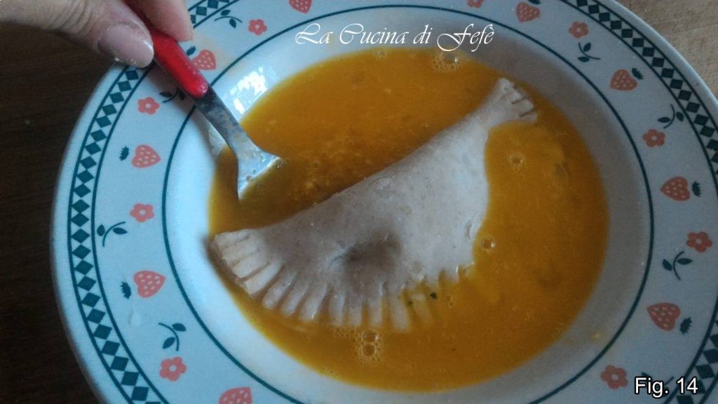 • Passez ensuite les sofficini d’abord dans un mélange d’œuf battu avec un peu de lait et une pincée de sel (fig. 14).