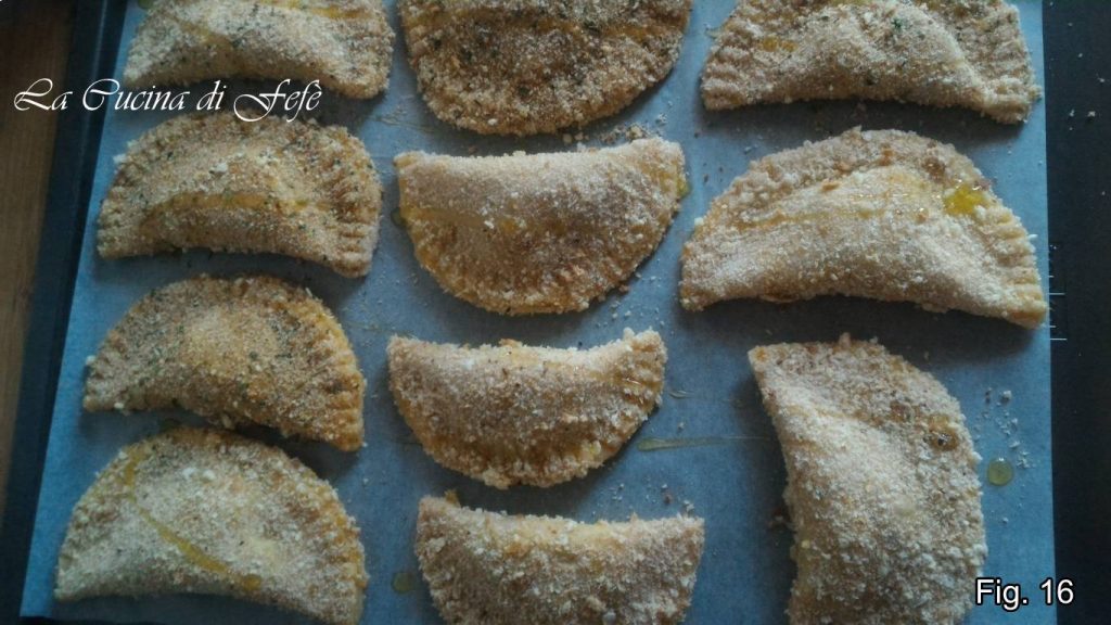 • Disposez les sofficini sur une plaque de cuisson recouverte de papier sulfurisé** et arrosez la surface d’un filet d’huile (fig. 16).