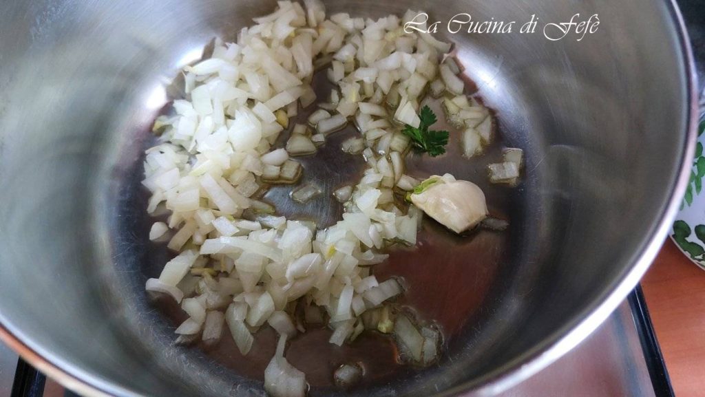 Prépare ensuite une base aromatique en chauffant un généreux filet d’huile dans une grande casserole et en faisant revenir l’ail et l’oignon émincé à feu vif.