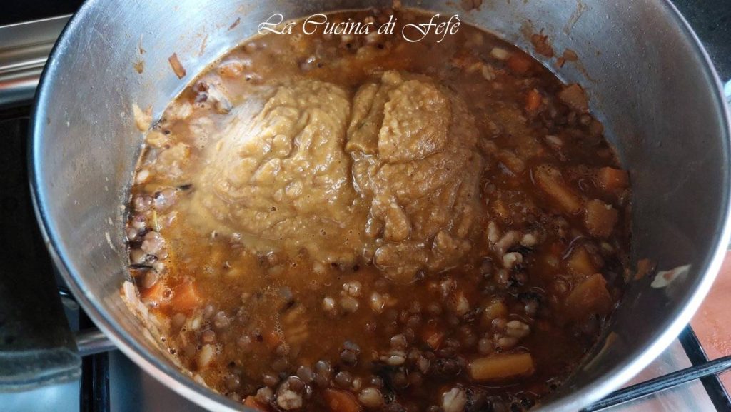 Après quelques minutes, couvre avec tout le reste du bouillon de légumes et porte à ébullition, puis baisse le feu au minimum et cuis pendant environ 25′.