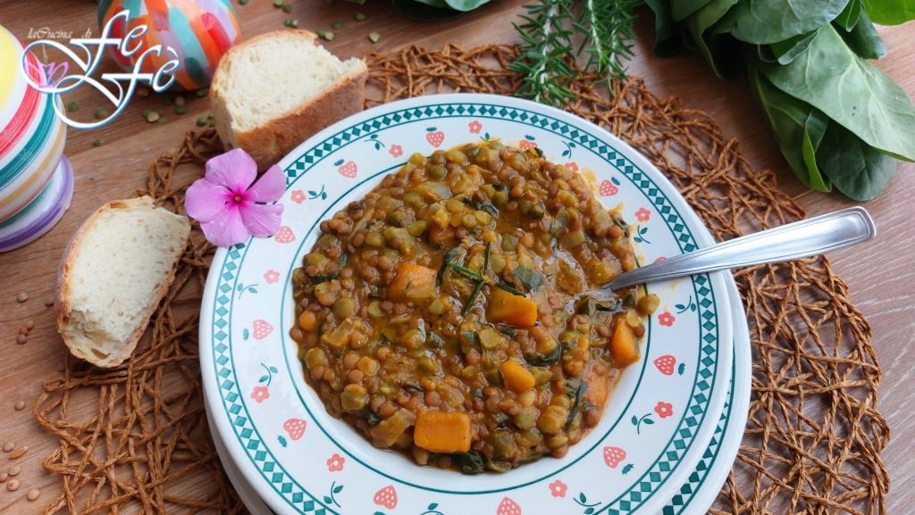 Avec l’arrivée de la saison automnale, les tables se garnissent de plats réconfortants, chauds et riches en légumes et légumineuses de saison. Les soupes, potages et veloutés sont mon humeur préférée, tant je varie continuellement toutes les combinaisons possibles pour créer des plats toujours authentiques et sains qui ne déçoivent jamais ! C’est le cas de cette soupe merveilleusement enveloppante, créée un peu par hasard avec ce que j’avais en réalité dans le frigo et que pour pouvoir la partager avec vous, j’ai dû la préparer une deuxième fois. Je dirais un sacrifice agréable en effet ! Et je vous dirai, elle est encore meilleure que la première, grâce à l’ajout juste avant de la servir d’un ingrédient secret, qui confère à l’ensemble une touche en plus ! Cette soupe est à base de deux types de légumineuses, lentilles et pois cassés verts, source de vitamines et de minéraux, en plus des protéines végétales. Le choix du potiron Mantoue n’est pas un hasard, car il est capable de donner un arôme noisetté que j’aime énormément, et l’association douce des blettes est absolument gagnante ! Je vous conseille de la servir pendant les mois froids d’hiver ou d’automne, car elle réchauffe corps et esprit ! Essayez-la avec des tranches de pain artisanal ou avec des croûtons au romarin, vous vous régalerez !