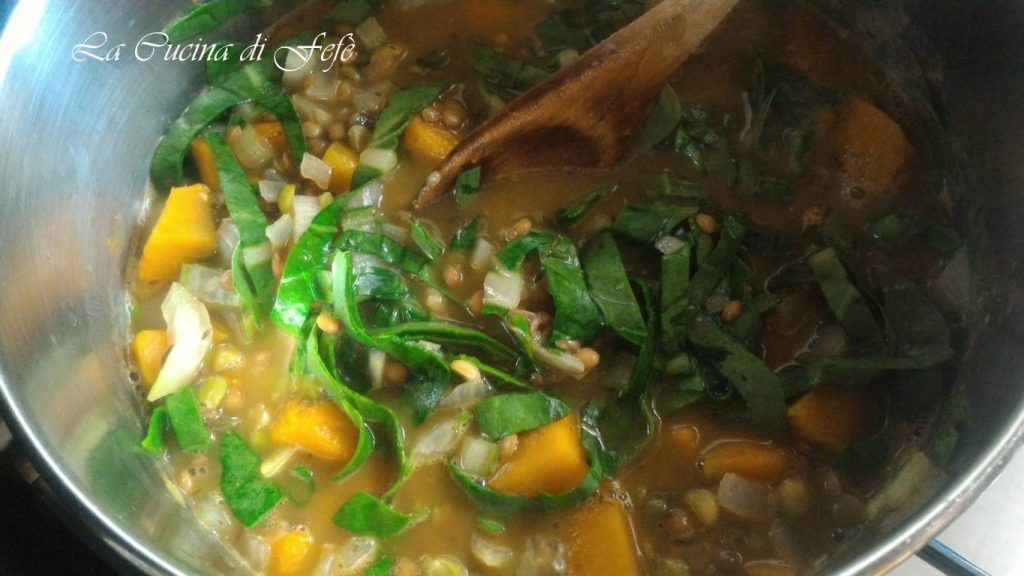 Complétez en ajoutant également les blettes et faites cuire pendant environ 30 minutes, en arrosant avec le bouillon restant si la soupe devait se dessécher trop