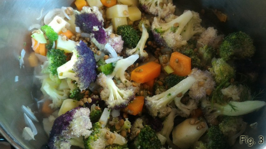 Baissez le feu, allongez avec une louche de bouillon chaud et ajoutez après quelques minutes les pommes de terre coupées en dés, les sommités de chou-fleur et les baies de genièvre.