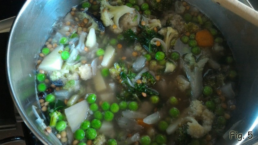 Ensuite, complétez avec les petits pois et les haricots verts coupés en morceaux et couvrez complètement votre minestrone avec le bouillon chaud.