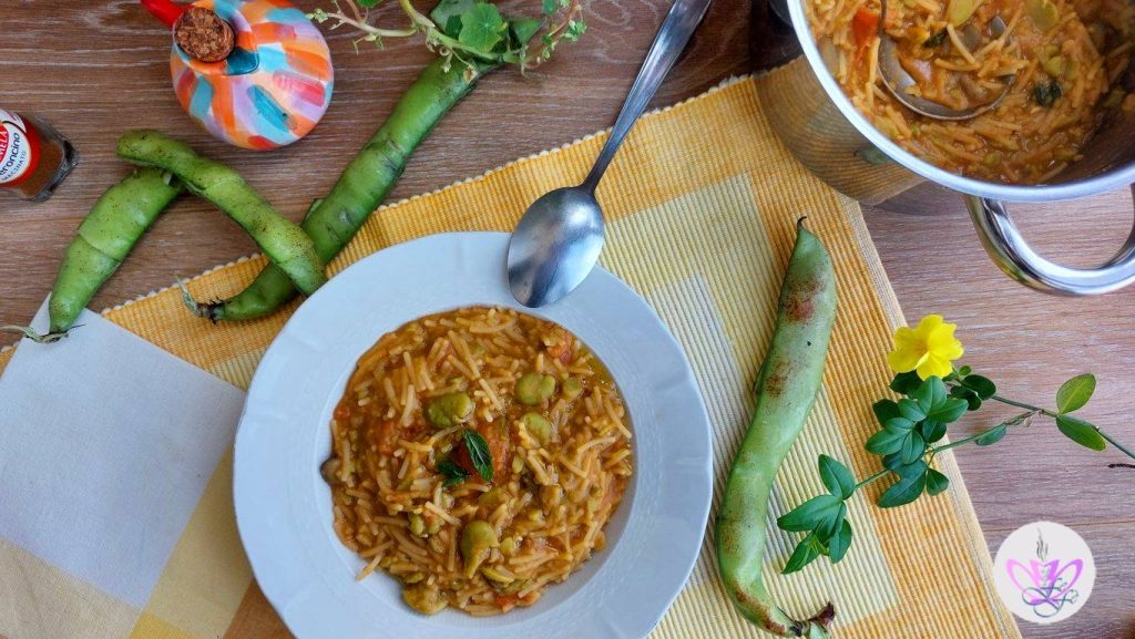 Et voilà… les spaghetti coupés avec fèves fraîches et tomate sont prêts à être servis.