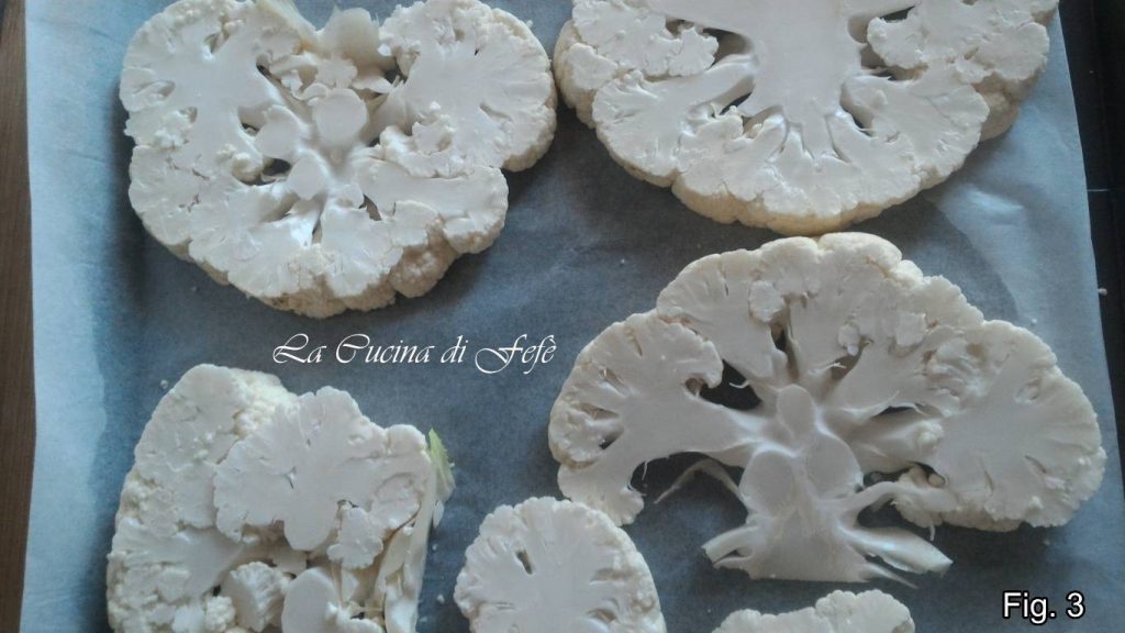 Après avoir nettoyé le chou-fleur, en ne retirant que la partie la plus coriace et extérieure du trognon ainsi que les feuilles extérieures, que tu pourras utiliser pour d’autres recettes, lave-le soigneusement sous l’eau courante et divise-le en deux (fig. 1).