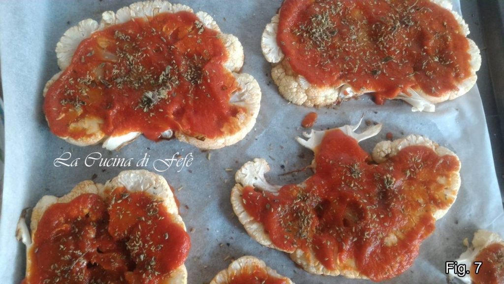 Passé ce temps, reprends les steaks de chou-fleur et assaisonne chaque tranche avec quelques cuillères de sauce tomate (fig. 6).