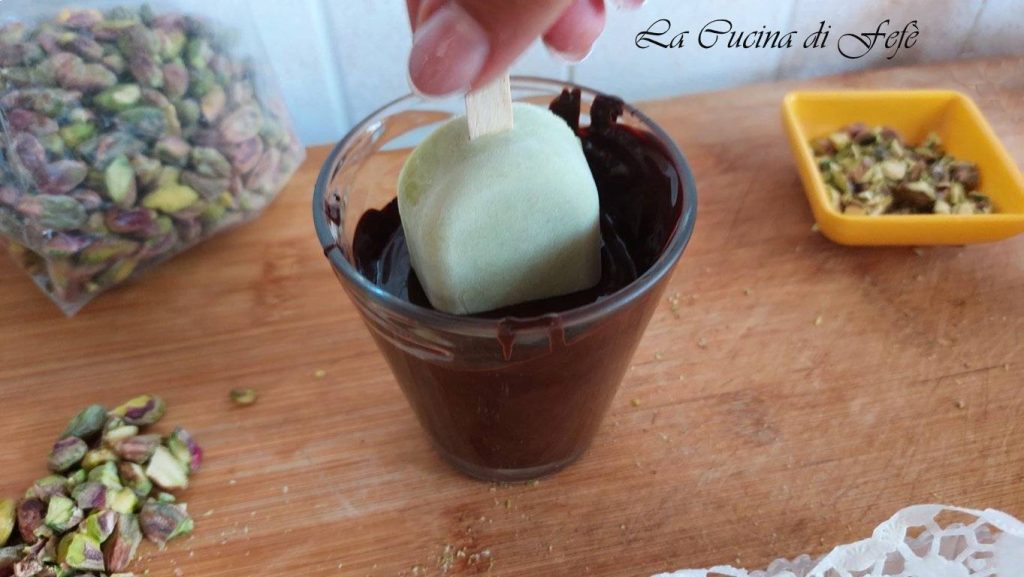 Laisses-les égoutter de l’excès de chocolat et, rapidement, garnis la surface d’éclats de pistaches avant que le chocolat au contact de la glace ne sèche.