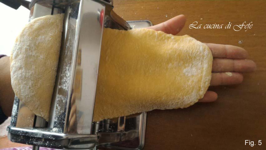 Enveloppez-la dans du film plastique pour ne pas l’exposer à l’air et laissez-la reposer 30′. Prenez une partie de la pâte, aplatissez-la un peu avec les mains ou avec le rouleau à pâtisserie, saupoudrez-la d’un peu de farine et passez-la dans les rouleaux, en commençant par l’épaisseur la plus grande (fig. 5).