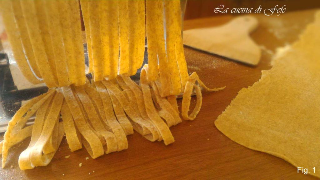 Comme je l’ai expliqué la semaine dernière, la recette de base originale des tagliatelles aux œufs faites maison prévoit 100 grammes de farine faible pour chaque œuf, mais une fois que vous vous serez familiarisé avec ce type de travail, vous pourrez vous amuser avec de nouvelles expériences ! Par exemple, avec cette recette que je vous propose aujourd’hui, vous pourrez vous initier à un goût plus corsé et rustique. Si vous êtes amateur, comme moi, de saveurs moins raffinées et plus prononcées, cette recette est faite pour vous et je vous recommande vivement de noter les doses, car vous en serez vraiment ravis ! Vous sentirez la consistance rugueuse palpable sous vos doigts à chaque étape du travail, à chaque étalement de plus en plus fin et parfait. La farine complète par rapport à la normale 00, est plus riche en fibres, aidant à contrôler le cholestérol. De plus, l’utilisation de la semoule de blé dur, plus courante dans le sud, ne change pas fondamentalement le procédé, mais, étant plus riche en protéines, vous permettra d’obtenir des pâtes avec une tenue de cuisson nettement supérieure. Il sera également intéressant de vous faire connaître dès que possible son utilisation dans la création de feuilles de pâtes fraîches sans œufs, mais uniquement avec de l’eau tiède, pour faciliter l’hydratation de l’amidon. Ce type de feuille sera idéal pour réaliser des raviolis ou d’autres formats tels que orecchiettes, cavatelli, bucatini, strozzapreti, etc. Bref, j’ai déjà faim, et vous ?