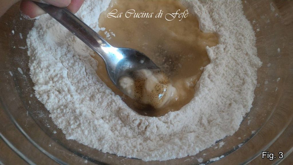Dans un bol, mélangez les poudres, c’est-à-dire l’érythritol avec la farine et la levure préalablement tamisées et une pincée de sel (fig. 1).