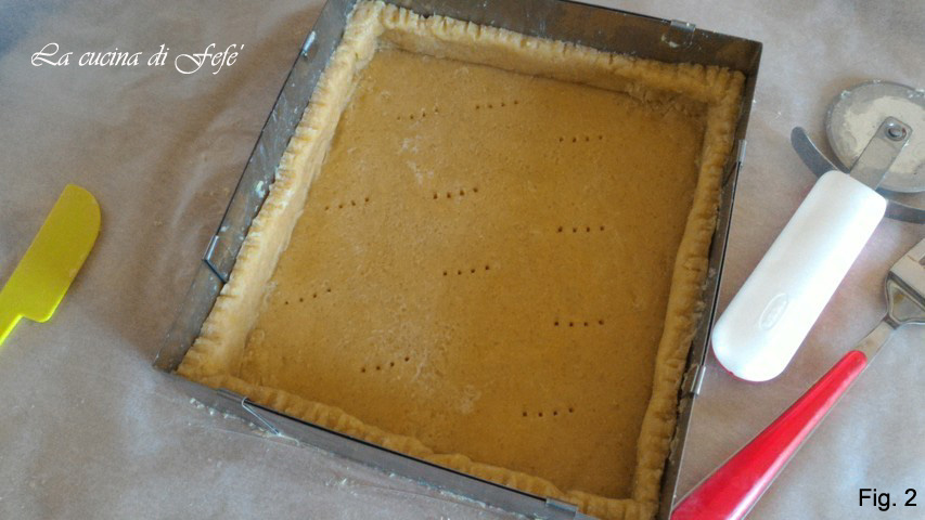 • Commencez par préparer la pâte sablée qui vous servira à réaliser la tarte en suivant toutes les étapes (ICI LA RECETTE). Une fois que la pâte a reposé au frigo, étalez-en 3/4 entre deux feuilles de papier sulfurisé avec un rouleau à pâtisserie et formez un carré d’une épaisseur de ½ cm comme pour un emporte-pièce à biscuits, et placez votre anneau réglable dessus. Découpez l’excédent de pâte et créez avec celui-ci les bords en les définissant avec les dents d’une fourchette. Piquez la surface et transférez le tout sur une plaque de cuisson recouverte de papier sulfurisé (fig. 2).