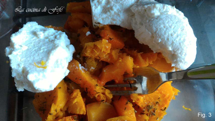 Enfournez à 200°C pendant 30 minutes, puis retirez la peau de la courge, écrasez-la dans un saladier avec une fourchette et mélangez-la avec la ricotta (fig. 3).