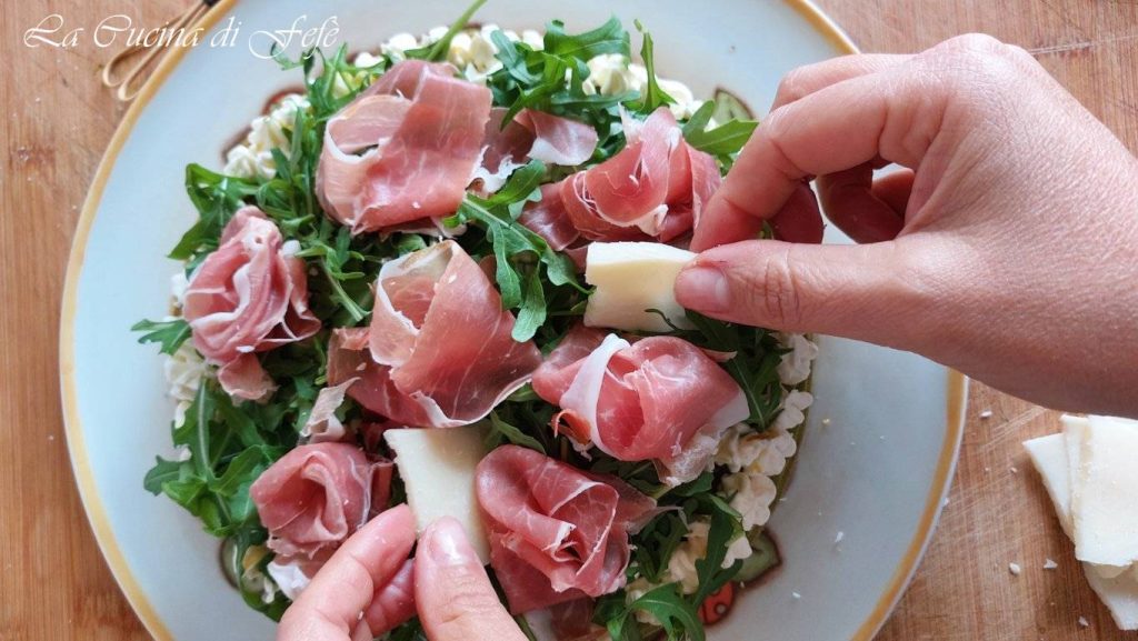 • À présent, déposez au centre les tranches de jambon cru, je les ai roulées en roses, puis terminez avec des feuilles de roquette fraîche et des copeaux de Grana.