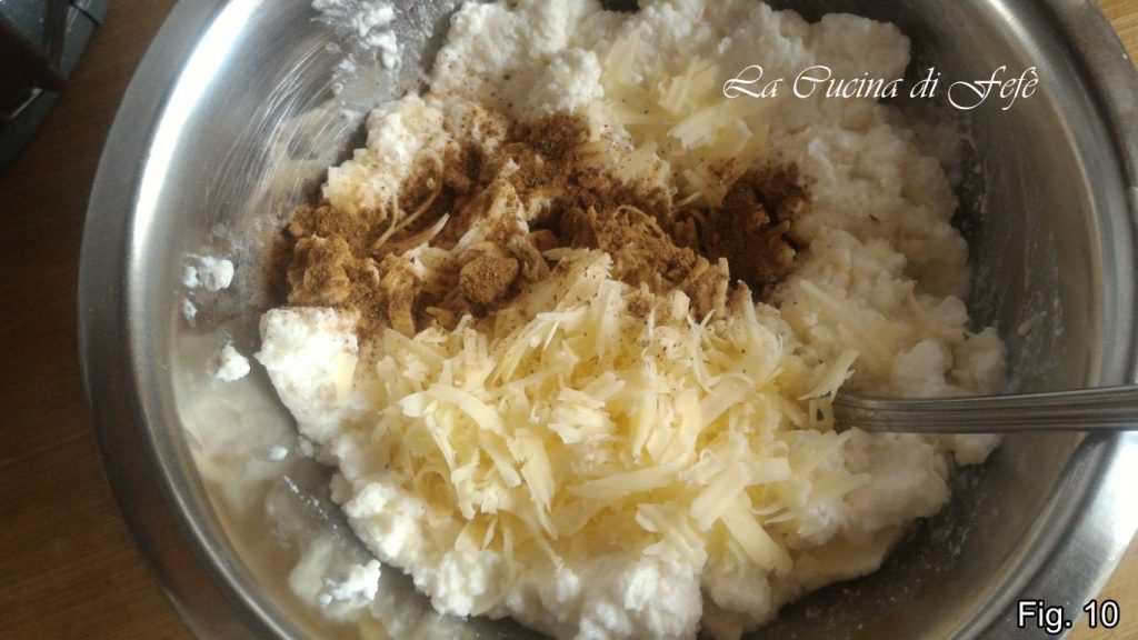 Pendant que le chou tiédit, dans un saladier travaillez la ricotta bien égouttée avec l’emmental râpé et la muscade.