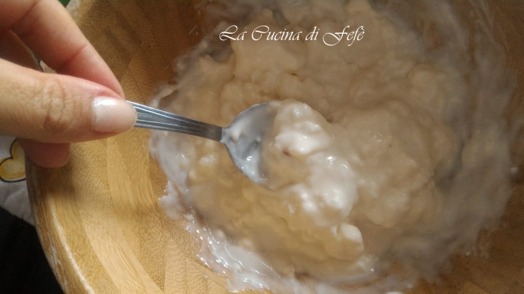 En attendant, préparez la garniture. Dans un bol, travaillez le squacquerone et le stracchino avec 1-2 cuillères de lait végétal jusqu’à obtenir une crème légèrement moins dense et plus maniable.