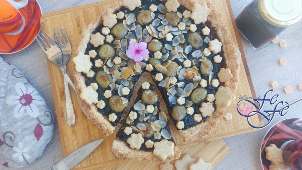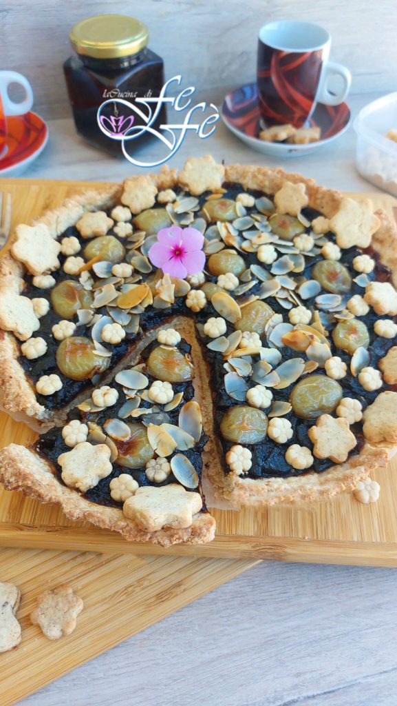 Il y a quelques jours, je pensais que c’était enfin le moment de commencer à ouvrir quelques pots de confiture préparés l’année dernière et de vider mes réserves d’hiver ! J’ai donc décidé de commencer par réaliser une tarte sans gluten qui pourrait surprendre et ravir une amie qui malheureusement est intolérante ! En réalité, les événements m’ont ensuite empêché de déguster cette tarte en sa compagnie comme je l’aurais souhaité ! Je m’imaginais déjà en train de bavarder devant une tasse fumante et aromatique d’infusion, comme c’est la tradition, et à la fin, je l’ai consommée au petit-déjeuner avec un cappuccino. Je dois dire que j’en avais envie depuis longtemps et cela a donc été une véritable douceur agréable ! La pâte de base de ce dessert est réalisée avec un mélange de farines sans gluten et une note aromatique donnée par les noisettes grillées qui sont hachées avec le sucre puis ajoutées au mélange. Pour la garniture, j’ai utilisé ma confiture de pommes et sucre muscovado, avec une légère note de gingembre. Pour ceux qui ne le savent pas, le sucre muscovado est un type de sucre de canne non raffiné de couleur foncée, auquel on ajoute un pourcentage de mélasse, ce qui lui confère son goût caractéristique. Bien sûr, il est difficile de trouver cette confiture dans le commerce, car c’était une de mes expérimentations, que je dirais réussie ! Vous pouvez donc utiliser celle que vous préférez, ce sera tout de même bien. J’ai ensuite garni avec des amandes effilées et quelques grains de raisin blanc pour créer un contraste visuel et gustatif qui nous a littéralement conquis !