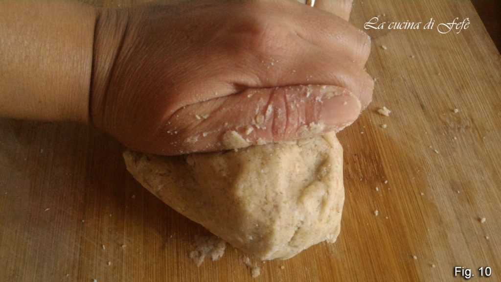 Quand la pâte commence à prendre consistance, transférez-la sur le plan de travail et travaillez-la encore quelques secondes jusqu’à obtenir une pâte lisse et homogène (fig. 10).