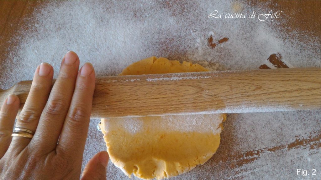• Étalez avec un rouleau à pâtisserie la moitié de la pâte sur une surface bien farinée, en gardant le reste de la boule toujours au frigo (fig. 2).