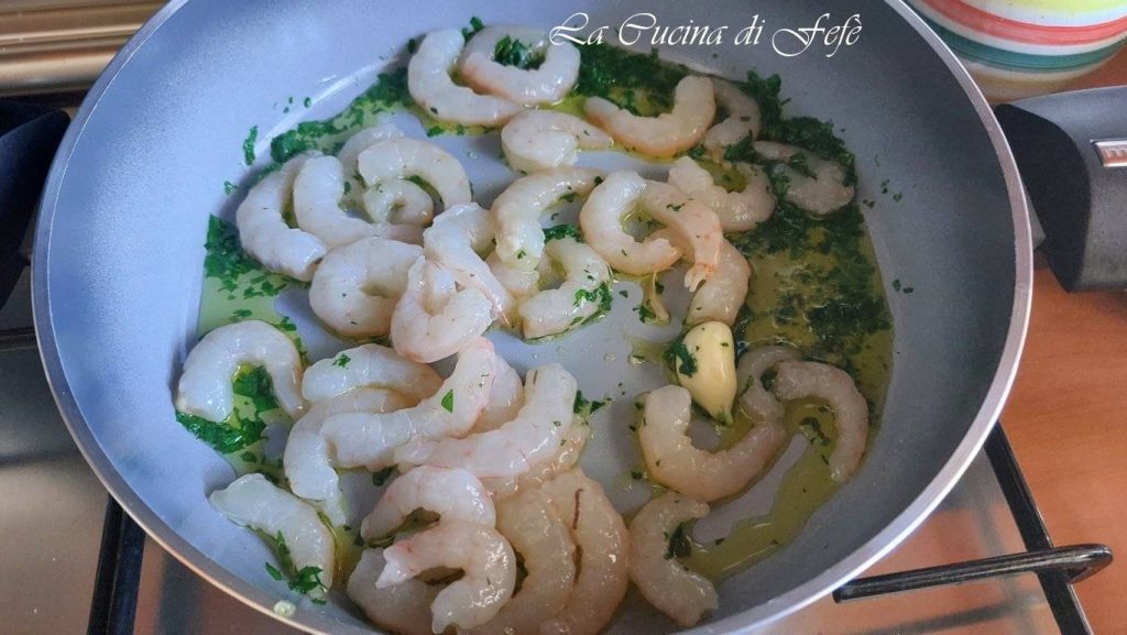 Dans une casserole, fais dorer quelques minutes à feu doux la gousse d’ail avec l’huile et le persil haché finement avec une mezzaluna.