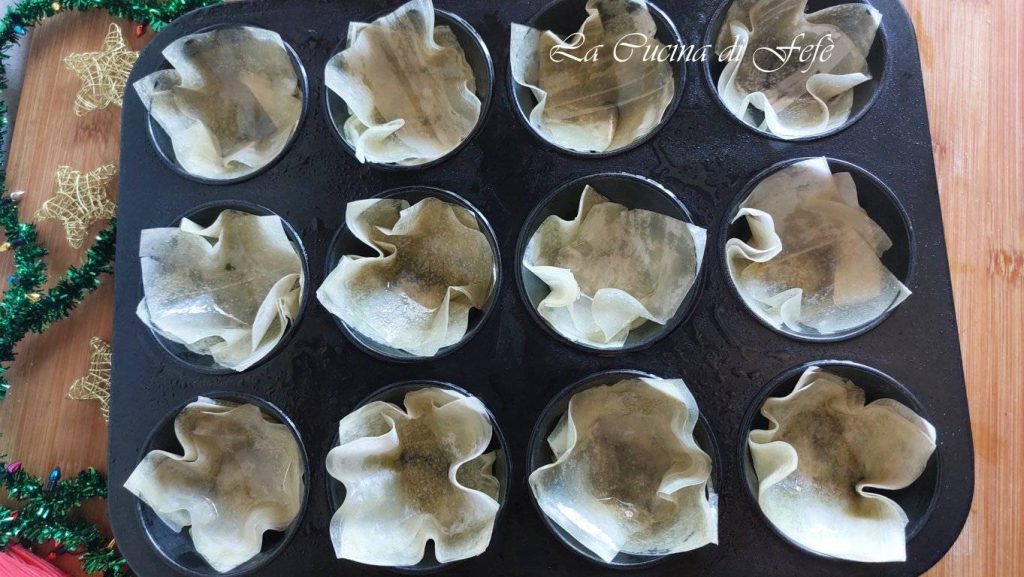 Huile un moule à muffins avec de l’huile et tapisse chaque cavité avec trois carrés de pâte filo, en essayant de les superposer en quinconce, c’est-à-dire sans faire coïncider les pointes, et en leur donnant une forme de panier.