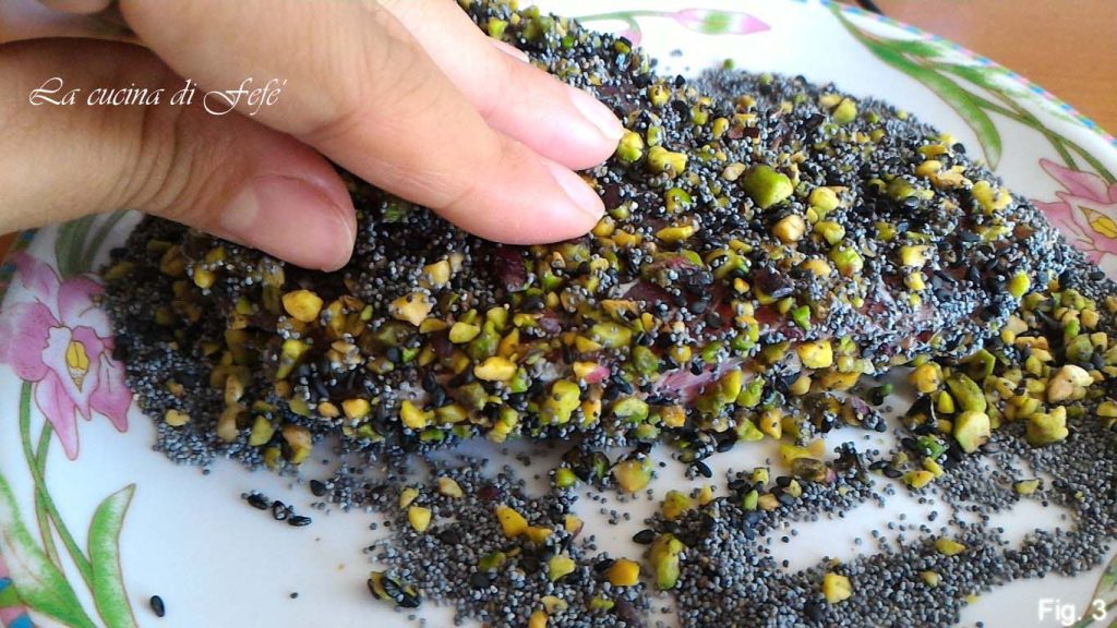 Après une courte pause estivale et quelques jours de repos à la maison de plage, je suis revenue pleine d’enthousiasme et d’idées simples mais savoureuses à proposer en cuisine ! J’espère vous avoir manqué comme vous m’avez manqué, mais parfois il est vraiment nécessaire de déconnecter de tout et de tout le monde, pour pouvoir se régénérer et recommencer du bon pied ! Je vous avoue que, profitant de ces jours de vacances, j’ai essayé de faire un peu plus attention à mon alimentation, et ces premières recettes seront sous le signe d’ingrédients qui s’inspirent du goût mais sans trop d’excès ! Ce que je vous propose aujourd’hui, par exemple, est un plat simple tant dans les ingrédients que dans la préparation, mais avec un excellent rendement et un grand effet scénique, ce qui ne gâche rien ! Si comme moi vous aimez le thon frais et les pistaches, alors vous devez absolument l’essayer ! Les tranches sont très tendres et fondent dans la bouche. L’ajout de pistaches de Bronte et de graines de sésame noires confère à l’extérieur un croquant spécial que je ne peux décrire, vous devrez l’expérimenter par vous-même ! Un seul conseil. Bien que facile et rapide, cette recette présente néanmoins quelques pièges, le premier étant la cuisson du thon ! Pour un résultat optimal, le filet ne doit jamais trop cuire, je conseille donc plutôt d’éteindre le feu en avance pour éviter que sa chair ne devienne sèche et dure, perdant ainsi toute sa saveur. Évidemment, je recommande trois minutes de chaque côté, mais en fonction de l’épaisseur, il faut ajuster le temps de cuisson. De plus, étant donné que ces temps sont relativement courts, assurez-vous que le thon a été préalablement congelé pour éliminer le risque de parasites. Une fois cuit, vous pouvez le servir coupé en tranches accompagné, comme je l’ai fait, d’une simple salade de saison ou si vous préférez, de légumes vapeur. Faites-moi confiance, vous ferez sensation !