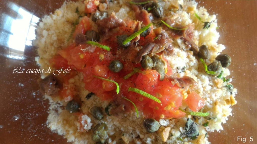 Mélangez. Ajoutez également la pulpe des tomates bien pressée, les filets d’anchois émiettés, les câpres dessalées sous l’eau courante et bien pressées et les zestes de citron (fig. 5).