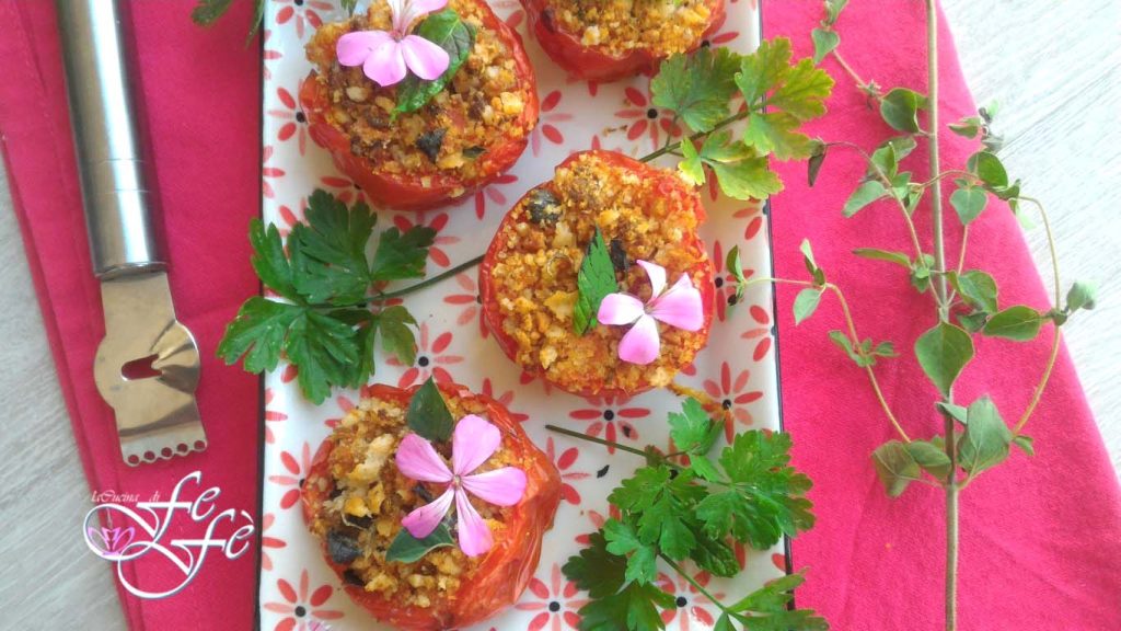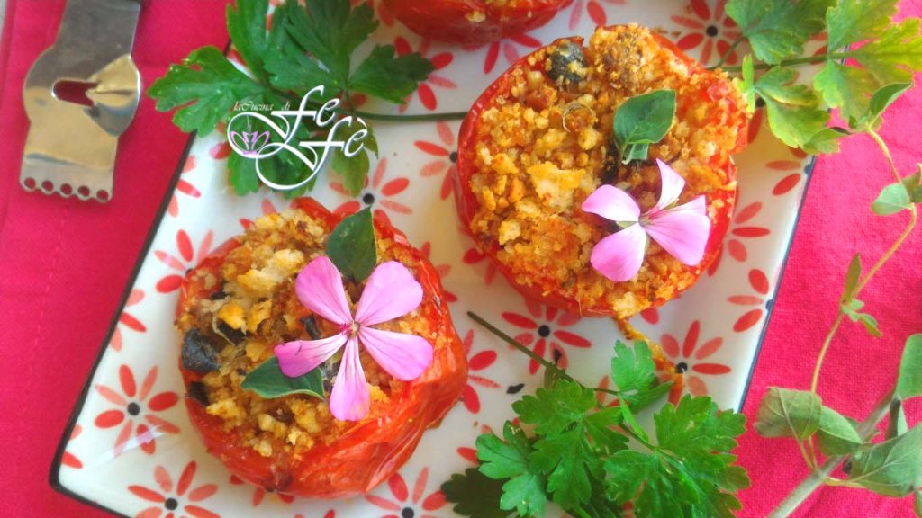 Aujourd’hui je vous propose cette recette, née un peu par hasard, initialement dans le seul but de consommer du pain rassis, et qui peu à peu s’est transformée en une idée vraiment savoureuse et délicieuse! En fait, même les tomates dans le frigo étaient un autre triste rappel de consommation urgente, alors je me suis retroussé les manches et j’ai créé ces délices à faire tourner la tête! En attendant, je vous invite à en préparer beaucoup plus que les six que je propose dans la recette, surtout si vous êtes une famille nombreuse, car ils partiront littéralement comme des petits pains! Ils sont également un excellent sauve-dîner, en effet ils se préparent en seulement 30 minutes! Il suffira d’assembler ce qu’il faut pour la panure, de farcir les tomates et de mettre le tout au four! À propos de la farce intérieure, je veux dire quelques mots, nécessaires. Le premier est un conseil. Utilisez du pain en surplus et non la chapelure habituelle que vous achetez au supermarché. Cela vous garantira cette belle croûte à la fin du gratin! D’ailleurs, les tomates sont farcies avec peu d’ingrédients simples mais de haute qualité comme les câpres de Pantelleria, quelques filets d’anchois, des zestes de citron et des herbes fraîches. Donc le choix d’ajouter des miettes de pain plus grossières est fondamental. Seulement ainsi elles deviendront un plat exquis qui, cuit à l’avance, pourra être servi à température ambiante même en guise d’entrée ou de finger food. Le second est un remerciement à mes oncles, qui en plus de m’avoir donné une belle quantité de mûres avec lesquelles j’ai réalisé la fameuse granita sicilienne, m’ont aussi offert de beaux citrons juteux et beaucoup d’herbes aromatiques! Parmi elles, l’origan frais, qui, croyez-moi, dans cette recette ajoute vraiment une valeur ajoutée en termes de goût et de parfum! Tout comme les zestes de citron, que j’ai évidemment ajoutés à la panure et que vous pouvez sentir à chaque bouchée!