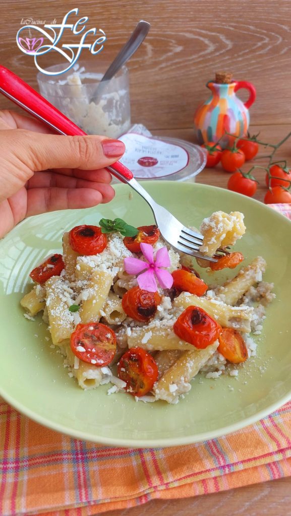 L’automne vient de faire son apparition ici en Sicile aussi ! Eh bien oui, mais pas dans le sens que vous croyez, mais uniquement en raison du fait que, comparé aux journées ensoleillées de ces jours-ci, nous avons assisté à un léger aperçu de pluie, que je ne pourrais certainement pas définir comme orageux, vu la faible intensité et la brièveté de cet épisode atmosphérique ! Une fois la pluie passée, le soleil est revenu, ainsi que la chaleur ! Je suis donc encore assez réticente à consommer des courges et des choux, j’ai donc décidé le week-end dernier de préparer à nouveau un premier plat aux notes encore estivales, qui a été vraiment apprécié chez moi pour ses odeurs et saveurs méditerranéennes ! Le choix des pâtes est personnel, je recommande néanmoins un type court, et encore mieux rainuré, capable d’accueillir pleinement la crémeux de la sauce. Il s’agit d’un premier plat de style végétarien à base d’aubergines et de tomates cerises au four avec de nombreuses herbes aromatiques, les premières ensuite mixées avec de la ricotta de brebis, les secondes laissées entières à ajouter lors du dressage final. Le résultat ? Une poésie, en fait, une complexité simple comme dirait une célèbre blogueuse culinaire. Trois étapes pour un plat à l’effet visuel assuré, de style gourmet, et à l’appréciation garantie.