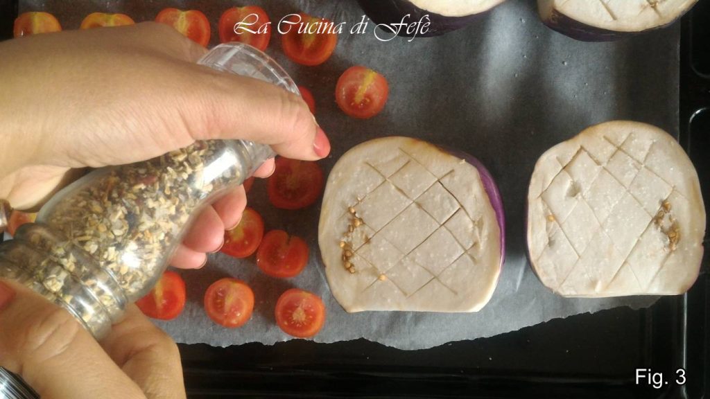 Nappez d’un généreux filet d’huile d’olive extra vierge, ajoutez les gousses d’ail en chemise* et mettez au four à 190°C pendant environ 20-25 minutes, puis retirez les tomates cerises avec une cuillère, probablement déjà cuites, remettez les aubergines au four et poursuivez la cuisson pendant encore 15 minutes. La chair de ces dernières doit être tendre et les dents d’une fourchette doivent y pénétrer facilement**.