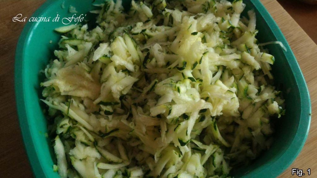 Transférez ensuite les courgettes bien sèches dans un grand saladier, ajoutez le parmesan et la provola râpée et mélangez (fig. 4).