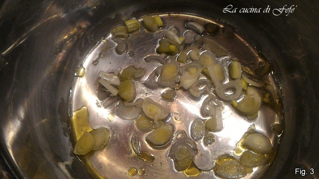 Dans une casserole avec un filet d’huile, faites revenir les oignons nouveaux coupés en rondelles (fig. 3).