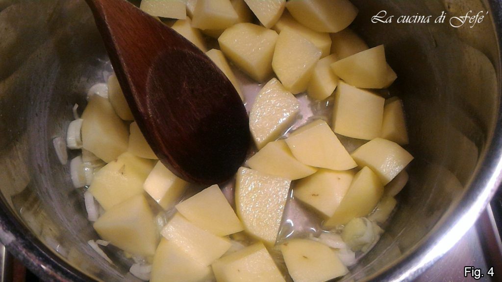 Ajoutez ensuite les pommes de terre et laissez-les s’imprégner pendant 1′ (fig. 4).