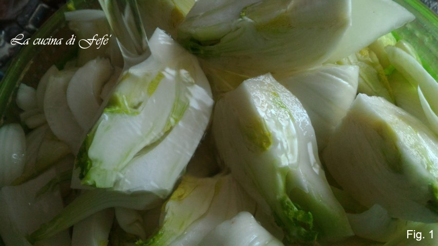 Nettoyez les fenouils, en éliminant les feuilles extérieures les plus abîmées mais pas les plumets, puis divisez-les en quartiers et lavez-les abondamment sous l’eau courante (fig. 1).