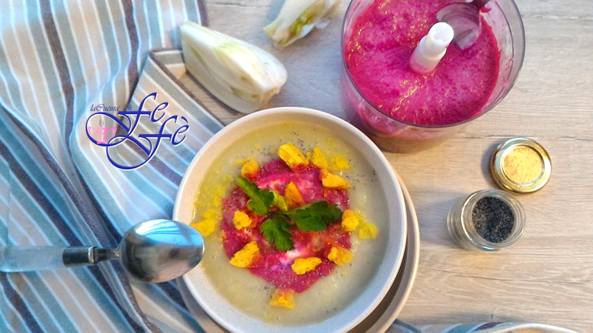 Et après deux semaines de festins culinaires entre Noël, Nouvel An et l’Épiphanie, on retourne enfin aux régimes habituels, ceux d’une alimentation saine, riche en vitamines et minéraux que seules les soupes peuvent nous offrir ! Alors, me voilà ici pour vous proposer un plat vraiment savoureux et léger, malgré ce que disent ou pensent ceux qui croient que manger seulement des légumes est triste et déprimant ! Il suffit de le faire avec fantaisie, en associant saveurs, épices et arômes, ce que je fais le mieux ! Comme beaucoup d’entre vous le savent déjà, je suis passionnée par les veloutés, j’en prépare toujours de différents et tous vraiment gratifiants. D’ailleurs, cette grippe m’a dévastée, j’en souffre encore, donc quel meilleur moyen que cela pour affronter le froid mois de janvier et récupérer de l’énergie ? La photo, je le sais, ne lui rend pas justice, l’après-midi, il fait déjà sombre, mais je suis certaine que vous me croirez sur parole si je vous dis que cet accord de saveurs est vraiment riche et unique ! J’ai ajouté du gingembre pendant la cuisson et des croûtons aromatisés au curcuma et au gingembre pour renforcer le plat, le tout saupoudré de graines de pavot et de bon pecorino sarde ou romain pour les plus gourmands. Une recette détox, avec toutes les qualités digestives et dépuratives des fenouils et celles réminéralisantes et rafraîchissantes de la betterave, utile pour le cœur, le foie, le côlon et le système vasculaire.