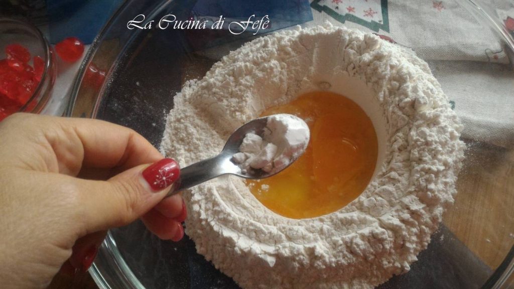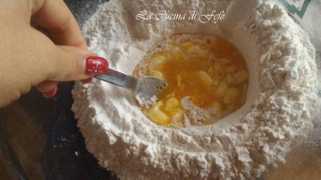 • En attendant, dans une terrine verse la farine (ou les farines dans ma version) et la levure tamisées, crée un puits au centre et bats à l’intérieur l‘œuf et les jaunes d’œufs.