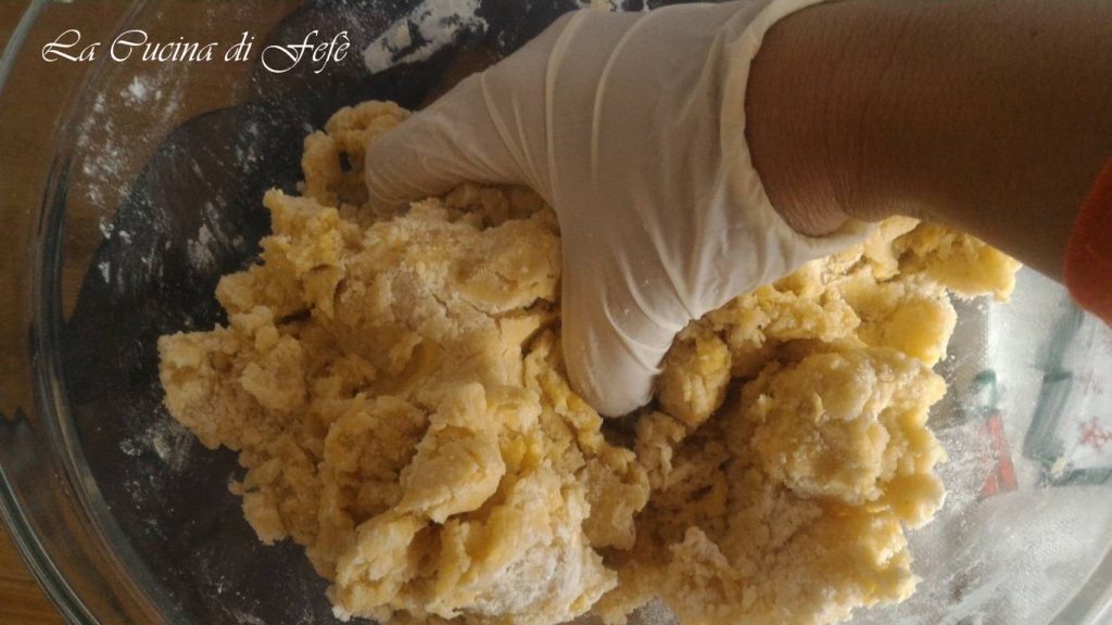 • Puis transfère sur le plan de travail et continue de travailler jusqu’à obtenir un pâte lisse et compacte. Enveloppe-la dans du film alimentaire et mets-la 30′ au frigo ou 15′ au congélateur.