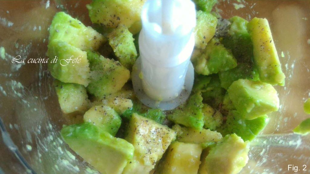 Divisez l’avocat en deux, retirez la peau et le noyau. Coupez-le en dés et placez-les dans un mixeur. Arrosez-les de la moitié du jus de citron, ajoutez un filet d’huile, un peu de gingembre râpé, une pincée de sel et un tour de moulin à poivre (fig. 2).