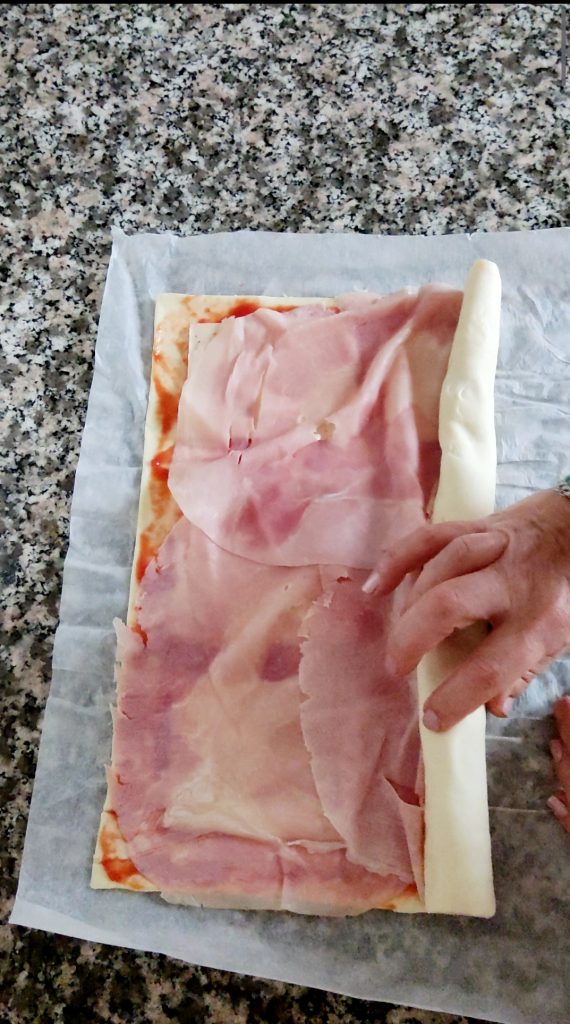 • Terminez avec les tranches de jambon cuit. Maintenant, en vous aidant du papier sulfurisé, enroulez délicatement du côté le plus long jusqu’à former un rouleau farci.