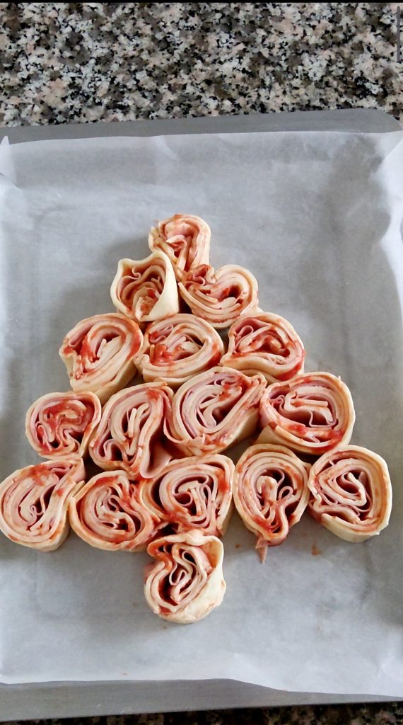 Arbre de roulés farcis avec tomate, jambon cuit et fromage. Mais que c’est joli et que c’est bon mon Arbre de pâte feuilletée au goût pizza très simple et rapide à préparer. Aujourd’hui, j’ai transformé un rouleau rectangulaire de pâte feuilletée d’abord en un rouleau farci, puis j’ai coupé de nombreux roulés et finalement je les ai placés sur une plaque pour former un délicieux et savoureux Arbre de feuilleté farci. Une entrée parfaite pour les prochaines fêtes qui étonnera et ravira famille et amis avec goût et délice. Ne le trouvez-vous pas parfait aussi comme un centre de table à déguster, petit à petit ? Je vous conseille également de lire la recette de mon Arbre rustique de pâte feuilletée. Et vous pouvez le préparer à l’avance et le conserver au réfrigérateur sans le cuire, ou vous pouvez le congeler pour l’avoir déjà prêt, à réchauffer seulement quelques minutes au four ou encore moins de temps au micro-ondes. Alors, vous ai-je déjà convaincu de l’essayer ? Courons donc en cuisine et préparons ensemble l’Arbre de roulés de pâte feuilletée