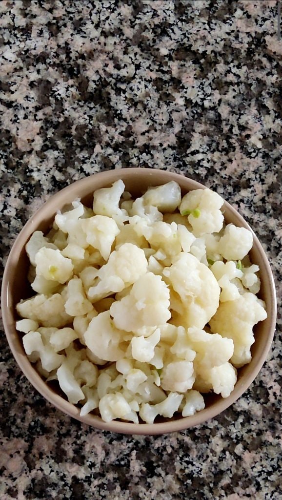 Nettoyez le chou-fleur en retirant les feuilles extérieures et le trognon. Divisez-le ensuite en petits bouquets. Lavez-le sous l’eau courante. Faites cuire le chou-fleur en le plongeant dans de l’eau bouillante salée pendant environ 10-12 minutes. Je vous conseille de tester la cuisson en le piquant avec les dents d’une fourchette. Égouttez-le et laissez-le refroidir.