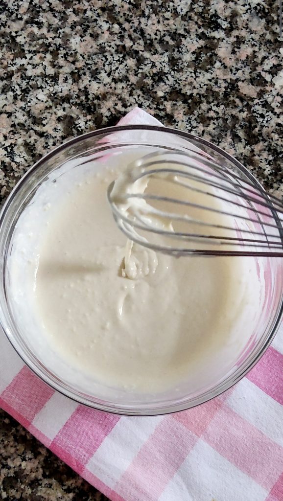 Ajoutez l’eau froide en filet et mélangez avec un fouet pour éviter la formation de grumeaux. Vous obtiendrez une pâte dense et fluide.